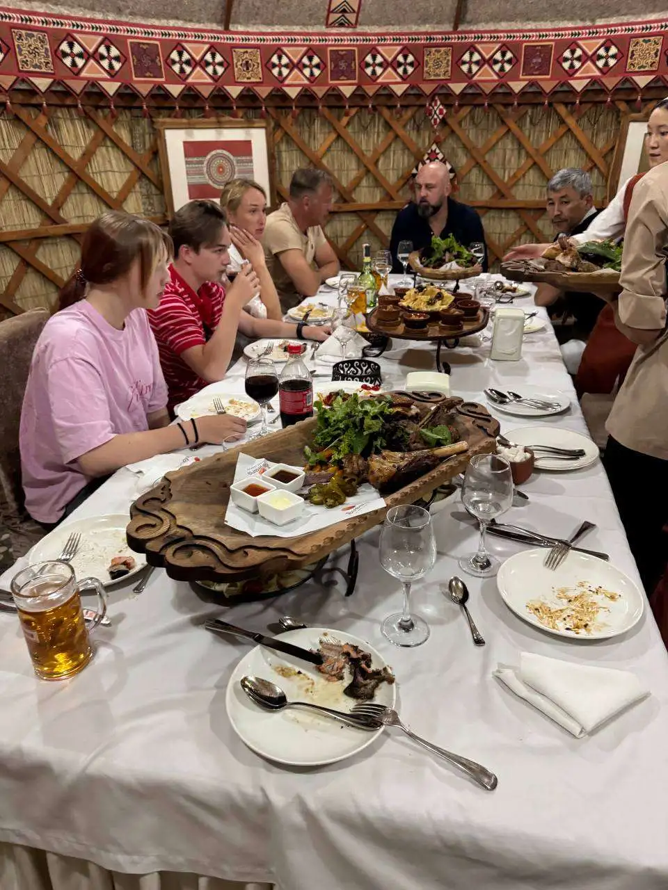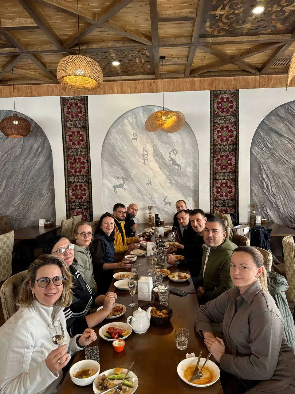 🌙 Главное событие вечера — праздничный ужин с восточным колоритом в атмосферном ресторане. Войлочные ковры на стенах, традиционные узоры, живая национальная музыка. Столы накрыты роскошно: плов с нежнейшей бараниной и морковью, мясо и рыба по-особому рецепту с ароматными овощами, сочная самса, разнообразные салаты, свежие лепёшки из тандыра. Мед, горячий зелёный чай, местные сладости. Каждый участник делится своими главными открытиями и планами на будущее. Атмосфера тёплая и эмоциональная — за эти 4 дня группа стала семьёй. Тосты, благодарности, искренние объятия. Вечер перетекает в ночь незаметно, но усталость приятная.